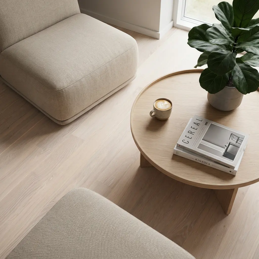 Den lyse, hvittonede eiken gir et delikat nordisk preg, mens Live Pure-overflaten beskytter effektivt mot flekker og søl, samtidig som treets naturlige struktur bevares. Resultatet er et gulv som både føles ekte og varer lenge.